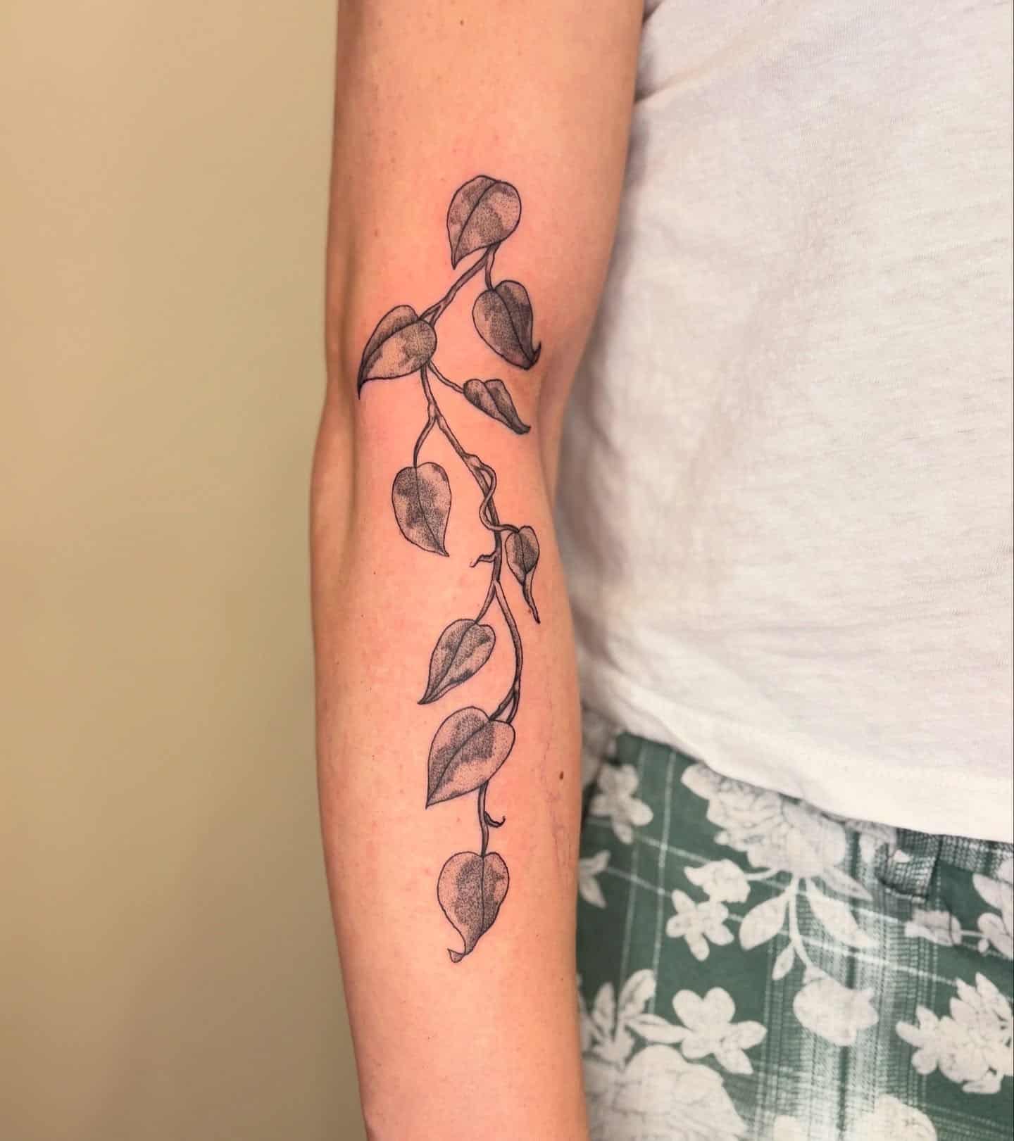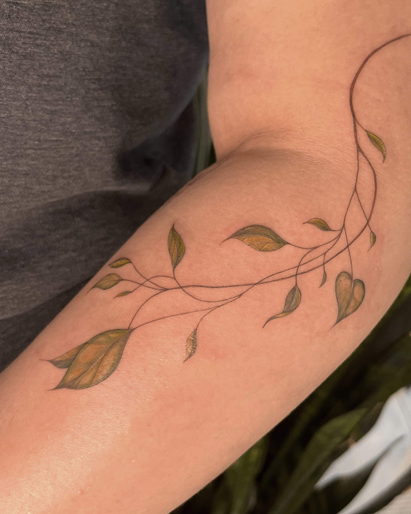 You guys, how stunning is this tattoo? It features a flowing design with the most delicate leaves that gracefully wrap around the shoulder and arm. The intricate details of the vines are so lifelike, it almost feels like a piece of nature has been perfectly captured in ink.