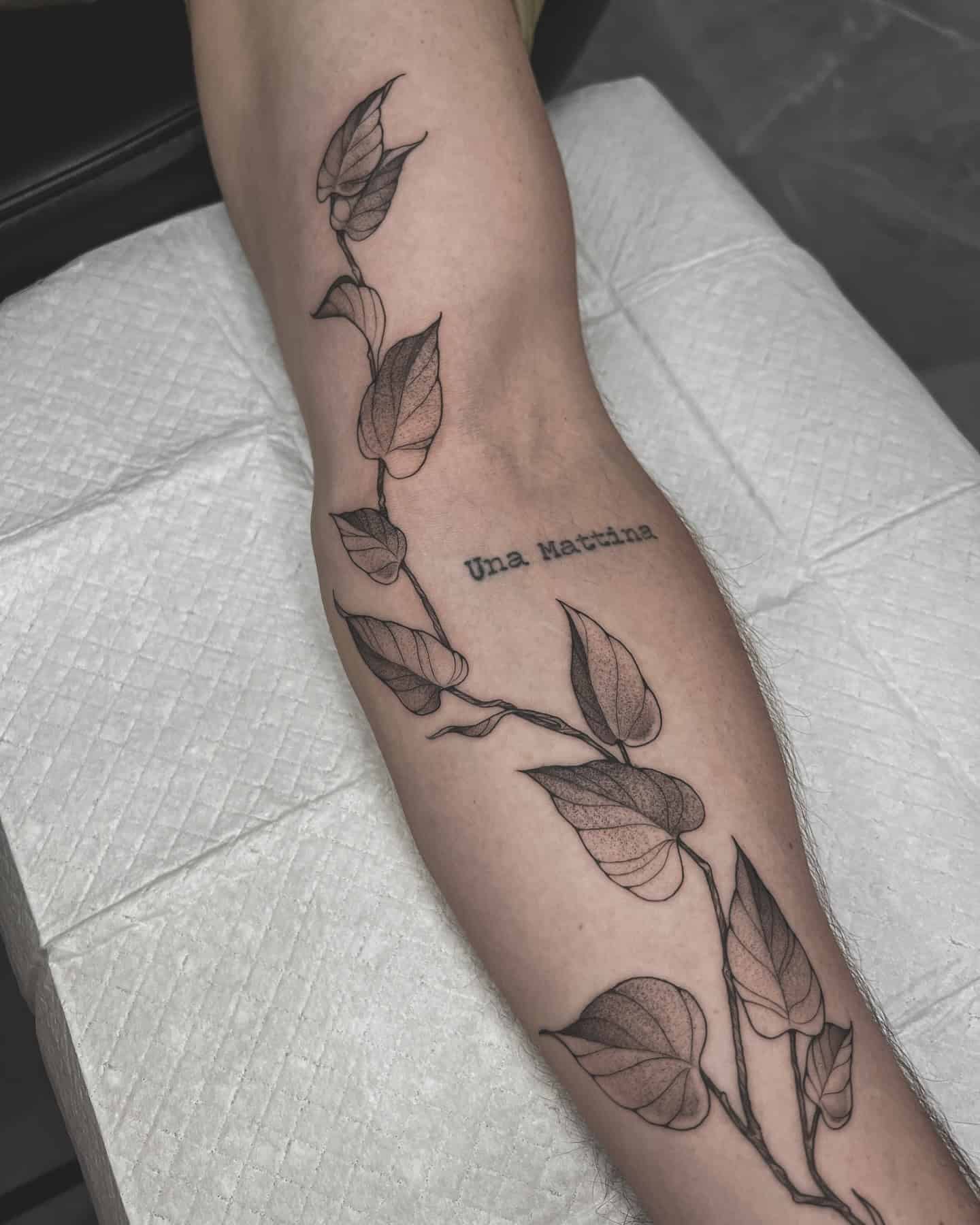 This tattoo is such a classic. It showcases a beautifully intricate vine that winds across the skin so gracefully and features delicate leaves and a charming little flower. It really captures the essence of nature in a way that feels both elegant and personal.