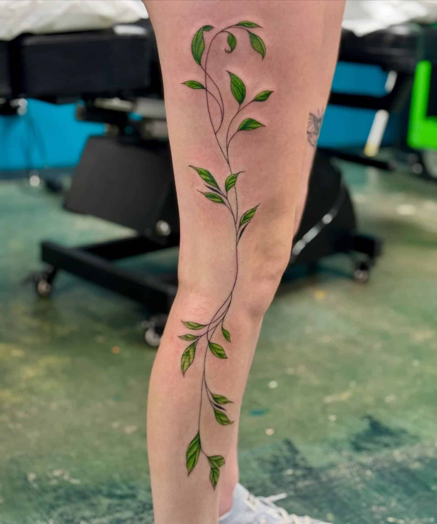 This stunning tattoo is one you’ll be thinking about for days. It has a delicate vine winding gracefully down the leg, and it’s adorned with vibrant green leaves that seem to dance with life. The intricate details and rich colors make it a true work of art, which showcases both creativity and personal expression.