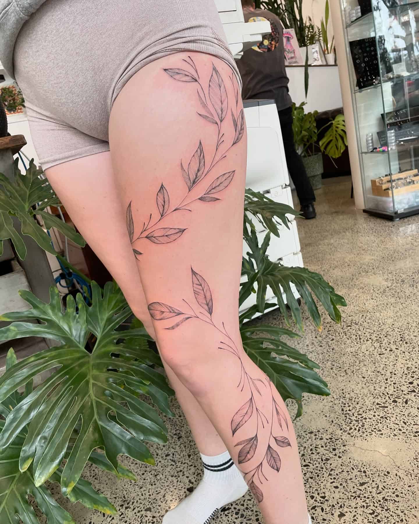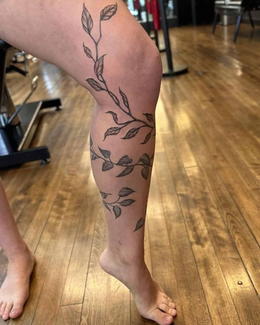 How beautiful is this tattoo? It features delicate vines that wrap so gracefully around the leg, showing off a stunning design that feels both natural and artistic. I am loving the soft lines and intricate leaf details because they create a sense of serenity.