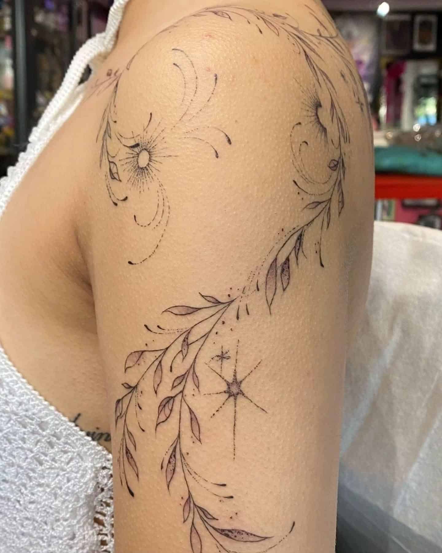 I’m just obsessed with how this stunning tattoo wraps so gracefully around the shoulder. It showcases delicate vine patterns that bring a touch of nature right to the skin. The fine lines and soft curves create a beautiful, flowing design that feels both organic and artistic.