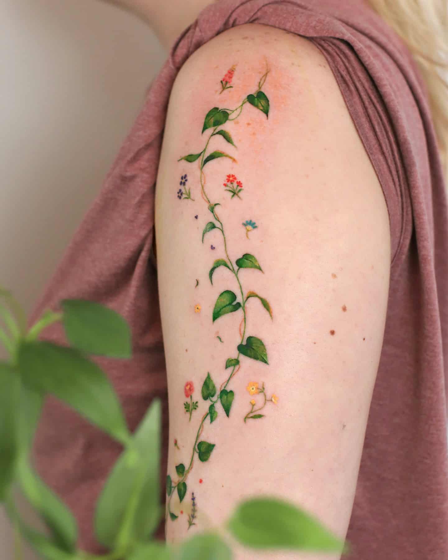 I’m completely obsessed with this tattoo. It wraps around the arm so beautifully and showcases a delicate vine with tiny, colorful flowers. Every little detail brings a sense of life and vibrancy. It honestly feels like nature is gently embracing the skin.