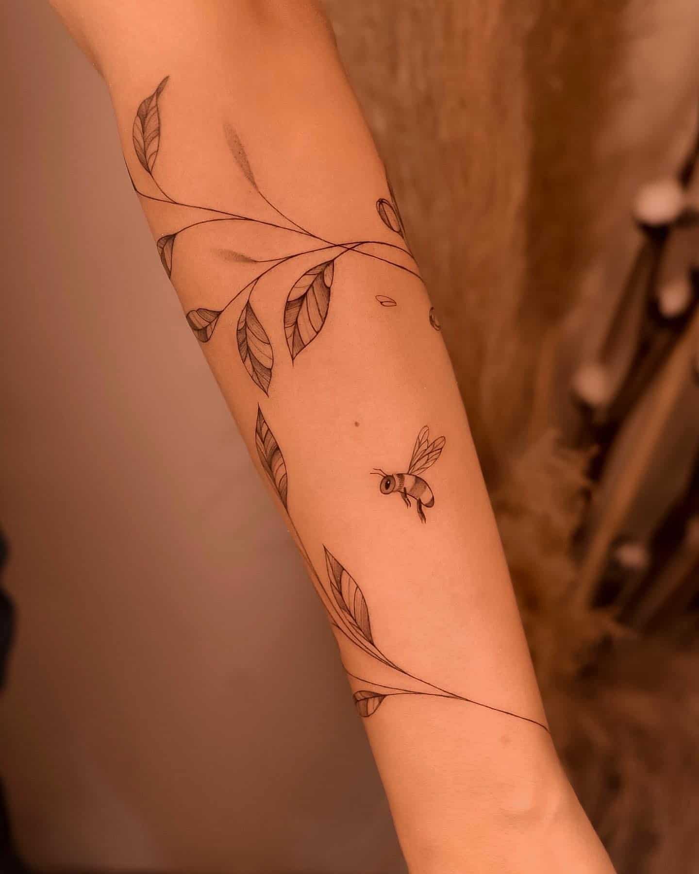 Let’s talk about this delicate vine tattoo that gracefully winds around the arm. I am obsessed with the vibrant leaves and the charming little bee. The combination of nature elements gives it a touch of whimsy and reminds me of the beauty you can find outdoors.