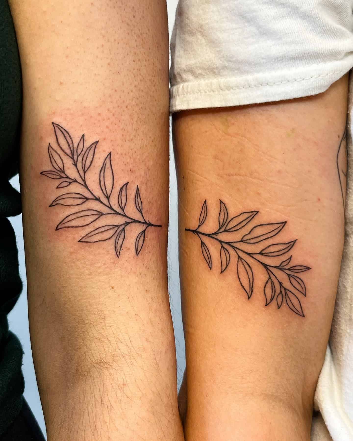 I am seriously obsessed with this idea. This image showcases two beautifully designed vine tattoos that connect the wearers in such a unique and meaningful way. The elegant lines and gentle curves of the vines symbolize growth and unity.