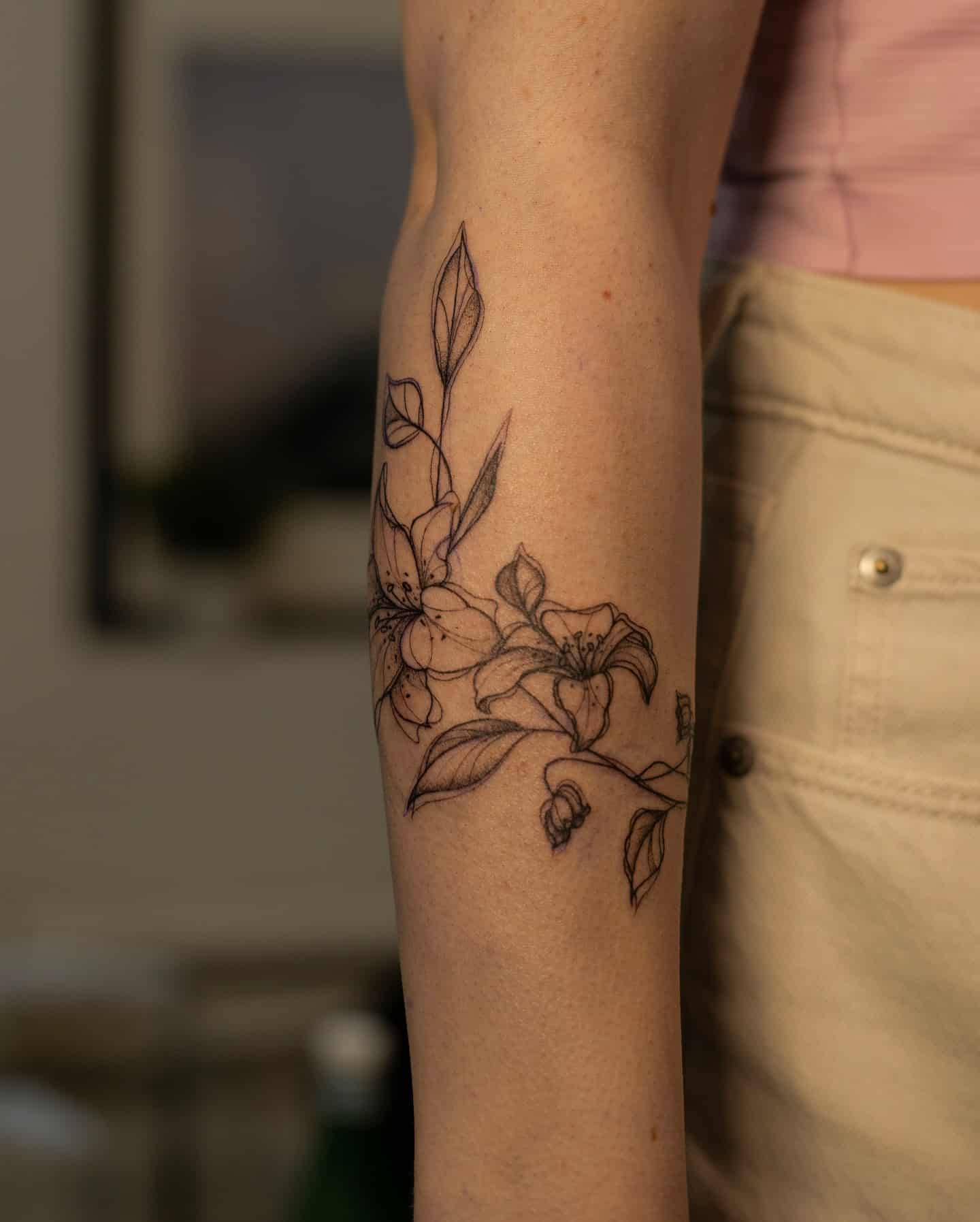 This image showcases a stunning arrangement of the most delicate floral designs that flow so gracefully along the arm. I’m obsessed with the combination of soft lines and intricate details. It creates such a unique look and is the perfect representation of personal expression.
