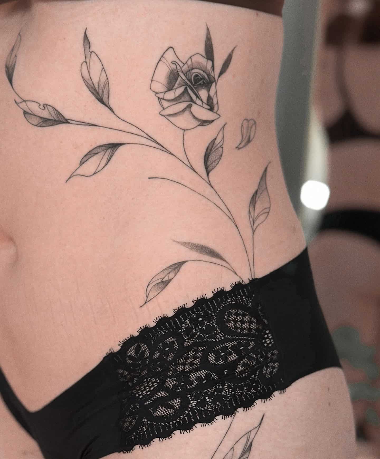 This tattoo has to be on your radar. It features a delicate arrangement of flowers intertwined with the most elegant vines, creating a design that is both soft and striking. The intricate line work gives it an extra touch of charm, making it a perfect way to show off nature’s beauty.