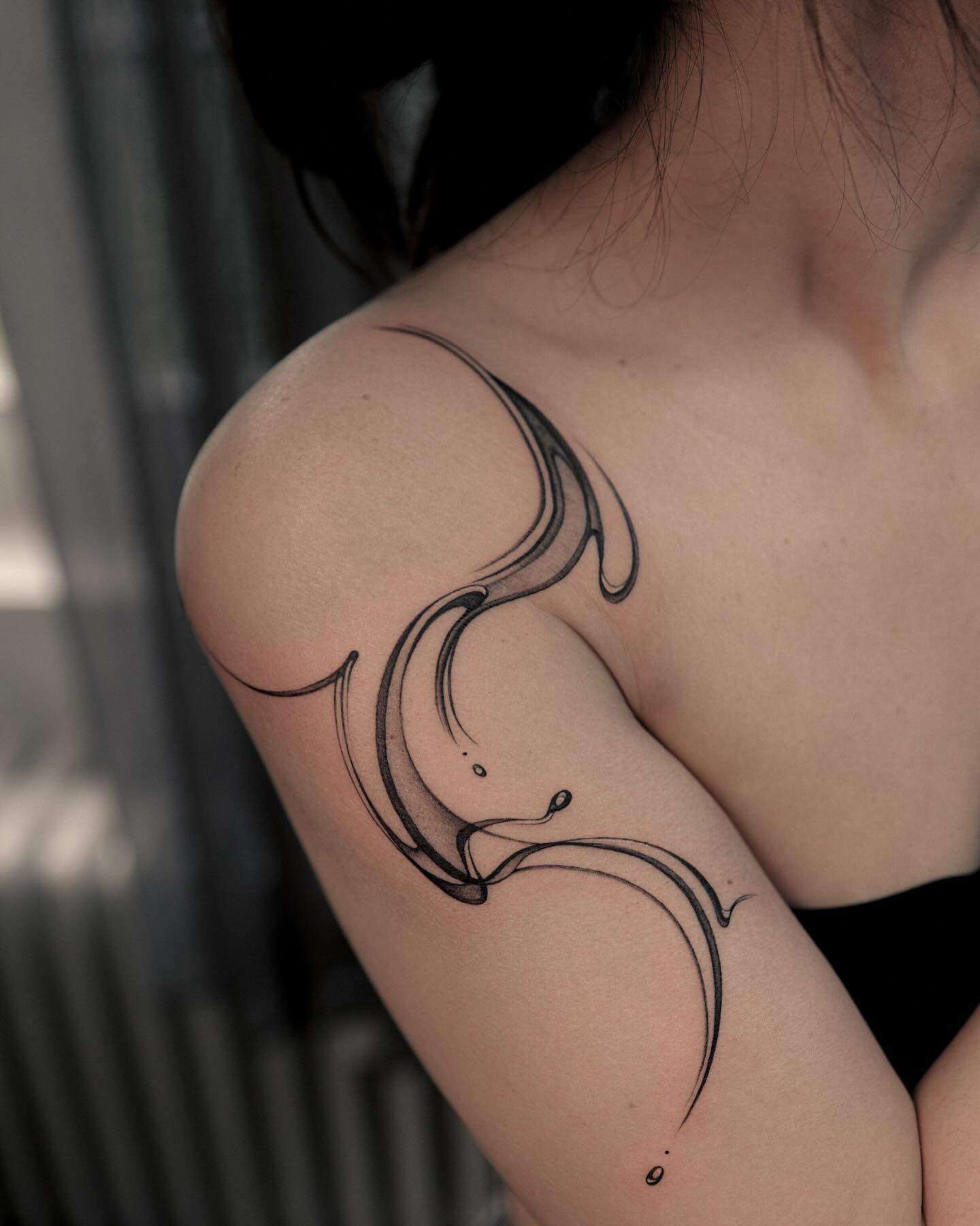 This image showcases a striking water tattoo that flows so elegantly along the shoulder. I love how the design captures the beauty of water with its smooth lines and gentle curves. It’s a stunning choice for those who appreciate artistic expression.