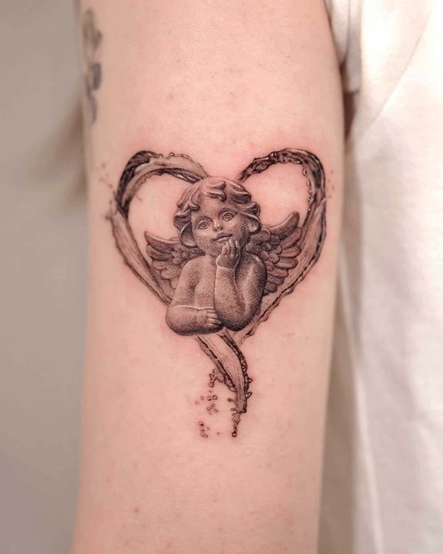 This tattoo is so unique and beautifully combines a cherubic figure with flowing water. Together they create a heart shape that symbolizes love and serenity. The delicate details of the angel’s expression add such a charming touch, which really makes it a standout piece.